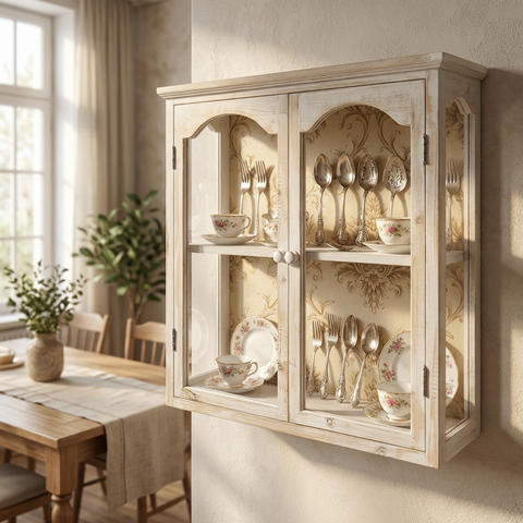 Wandschrank Landhausstil aus Holz – Cremefarben mit Glastüren – ca. 58,5x18x71 cm